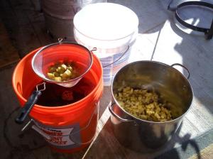 Boiled about 2.5 gallons of water and dumped it in there to get all the sugar into solution and then poured everything thru my strainer into the ferment bucket.